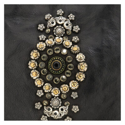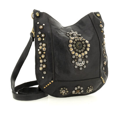 Bolso bandolera Nora en piel de vacuno teñida en prenda con tachuelas y pedrería.