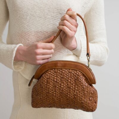 Bolso bandolera de piel vacuna lavada, y trenzada a mano. Asa de hombro extraible, bandolera ajustable y extraible, cierre con cremallera, bolsillos internos, y forro de algodón.
