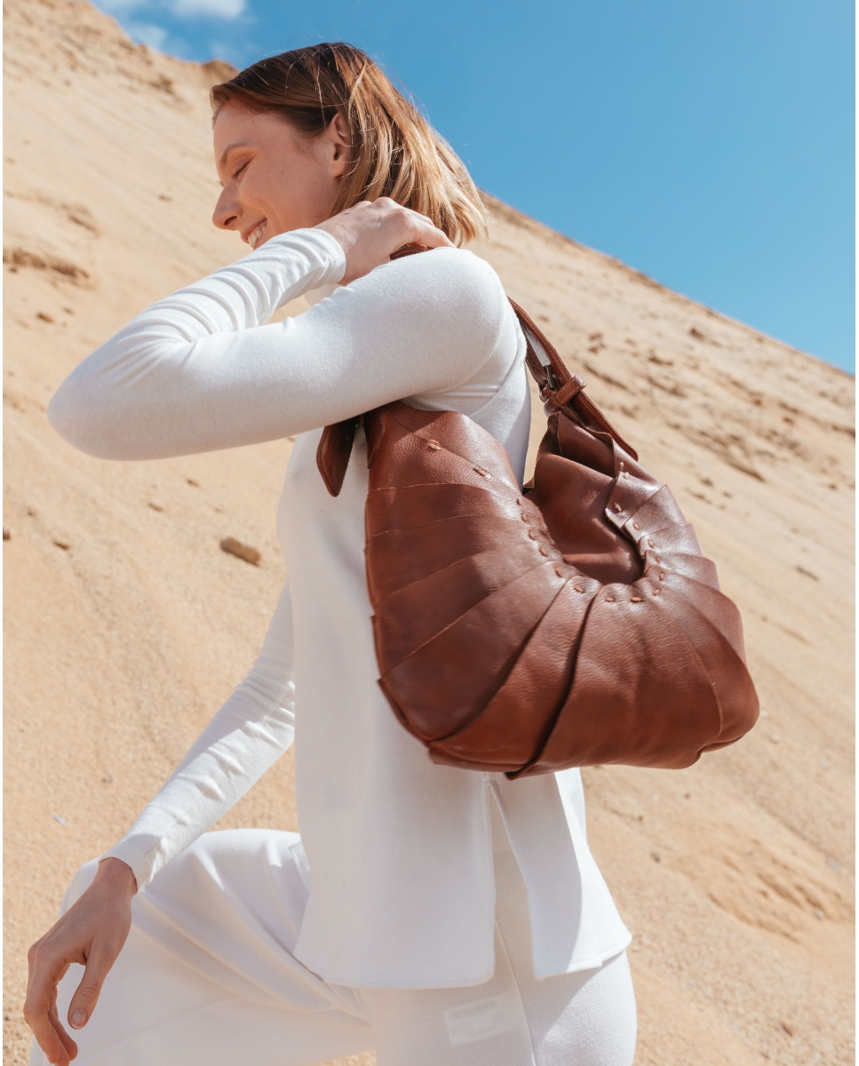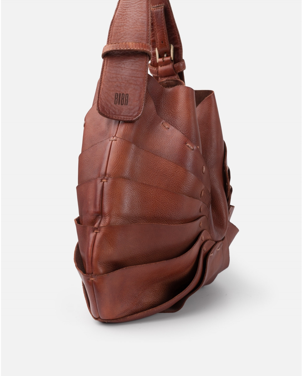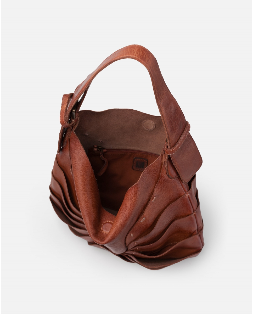 Bolso de piel vacuna lavada. Original diseño de capas superpuestas inspirado en la naturaleza. Asa de hombro ajustable, cierre con iman, bolsillos internos, y sin forro.