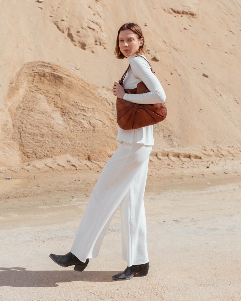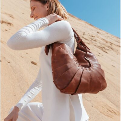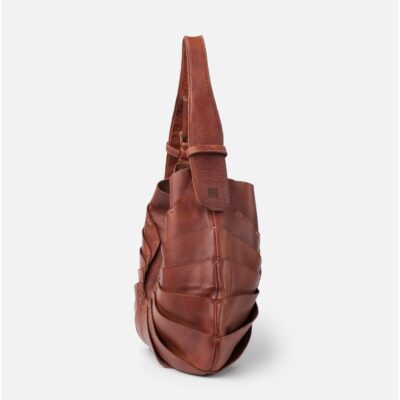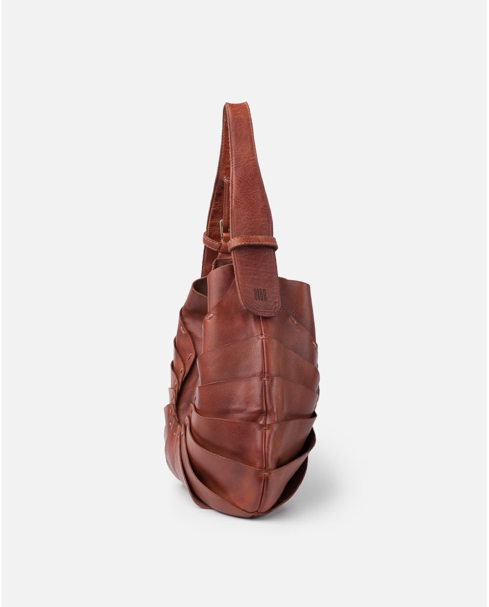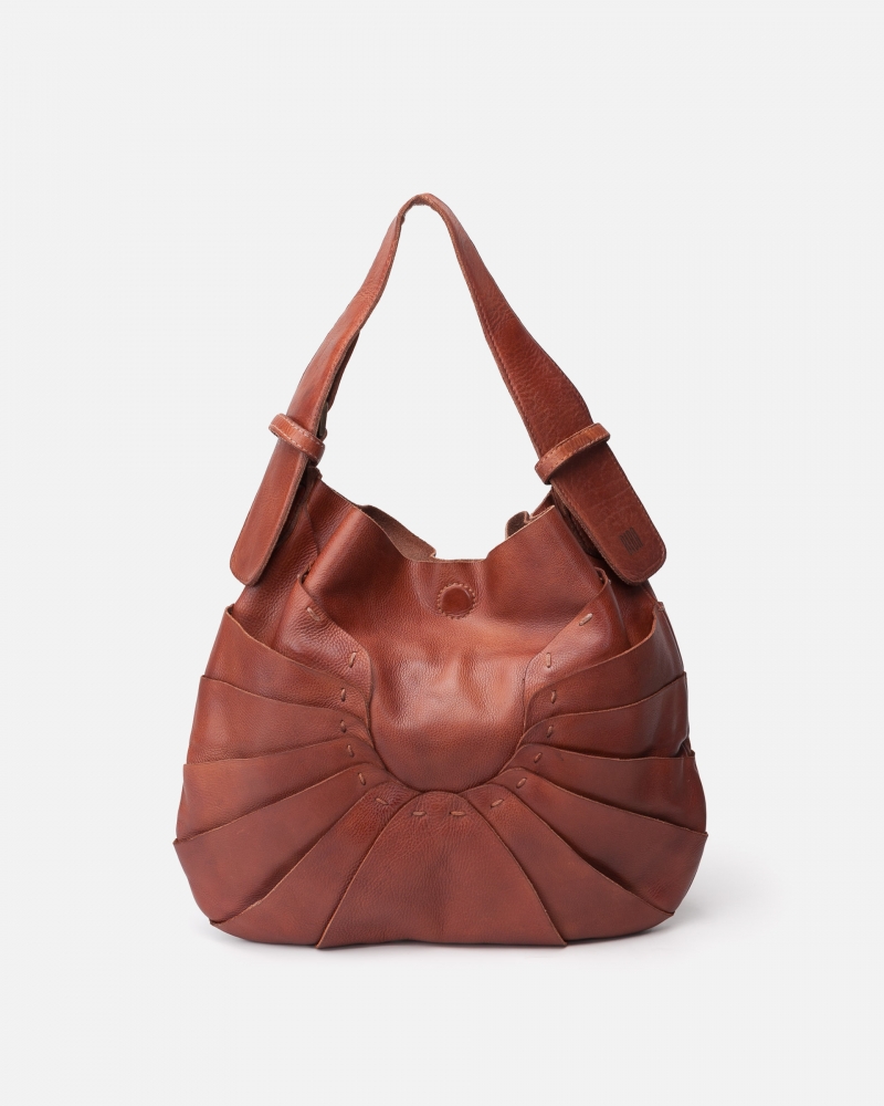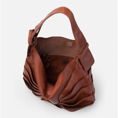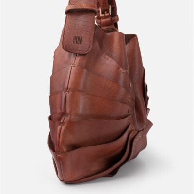 Bolso de piel vacuna lavada. Original diseño de capas superpuestas inspirado en la naturaleza. Asa de hombro ajustable, cierre con iman, bolsillos internos, y sin forro.