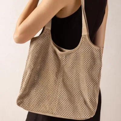 Bolso mediano fabricado en ante con picados. Cierre con imán y bolsillo interior de cremallera. Disponible en varios colores, ¿cuál es tu favorito? Medidas: 28cm x 29cm x 14cm