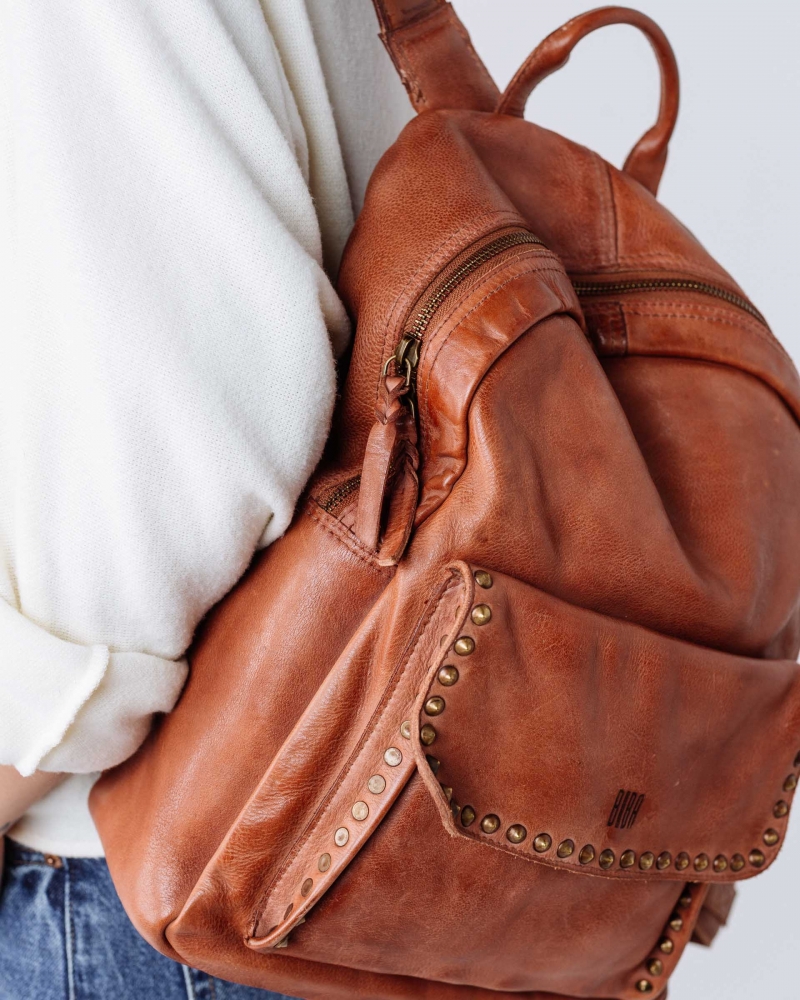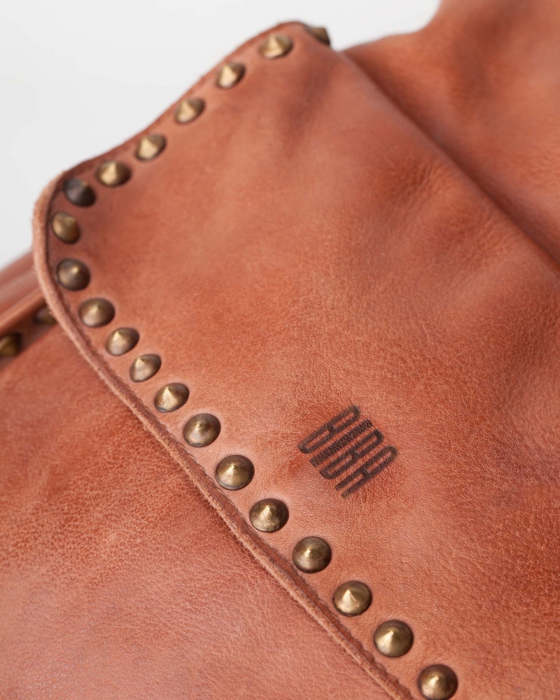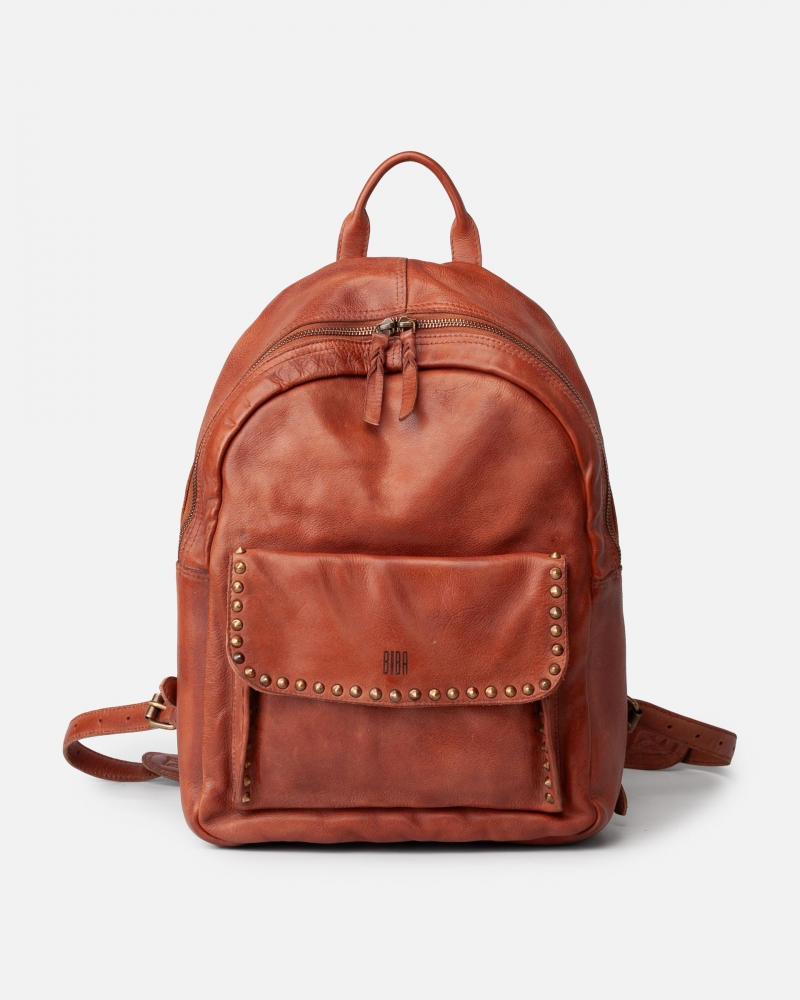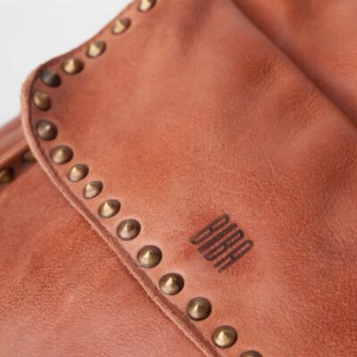 Mochila de piel vacuna lavada, y de curtición vegetal. Destacan las tachuelas envejecidas en la parte frontal. Correas acolchadas y regulables, asa de mano, cierre con cremallera, bolsillos internos y externos, y forro de algodón.